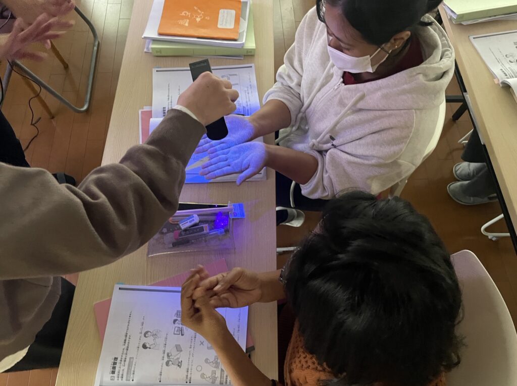 蛍光塗料とブラックライトを用いた方法で手洗いの指導をしています。
