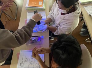 こんにちは! 介護職種の技能実習生の皆さんが、感染対策の手洗いについて勉強していました。 くまかいの講習では、手洗い後の汚れの残り方を可視化するため、 蛍光塗料とブラックライトを用いた方法で手洗いの指導をしています。 手を洗った後にブラックライトで確認すると、 汚れに見立てた蛍光塗料が、爪や指のあいだに残っているのを見て、皆さん驚いていました。 そのあと、適切な手洗いの方法について学びました。 皆さん、一生懸命に講習に取り組んでいます。入職まであと少し、一緒に頑張りましょう!